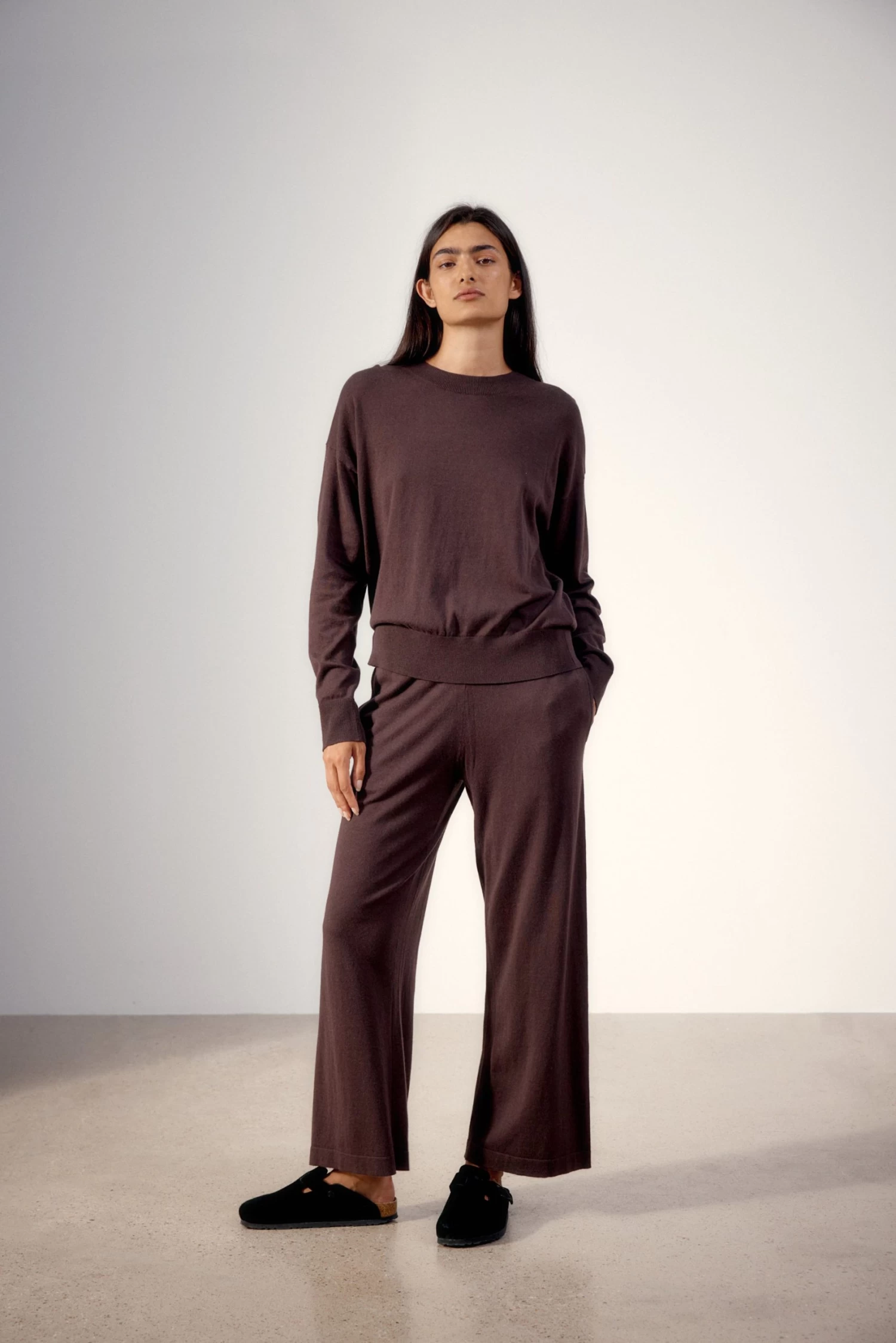 The loungewear-inspired Cotton Cashmere Wide Leg Lounge Pant is designed with comfort and ease in mind. Knitted from cotton and cashmere yarns, this relaxed pant has a wide leg fit, pockets and elasticised waistband with an adjustable drawcord. Slip these cotton cashmere pants on and wear as a knitwear set with the Cotton Cashmere Lounge Sweater.