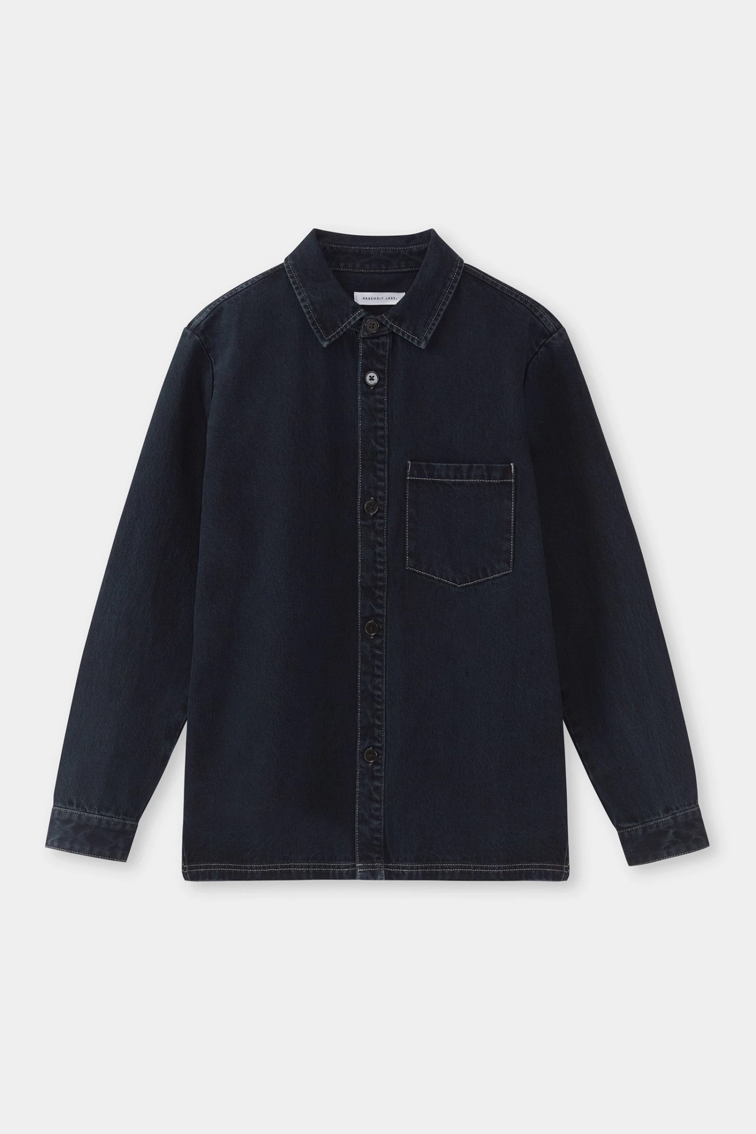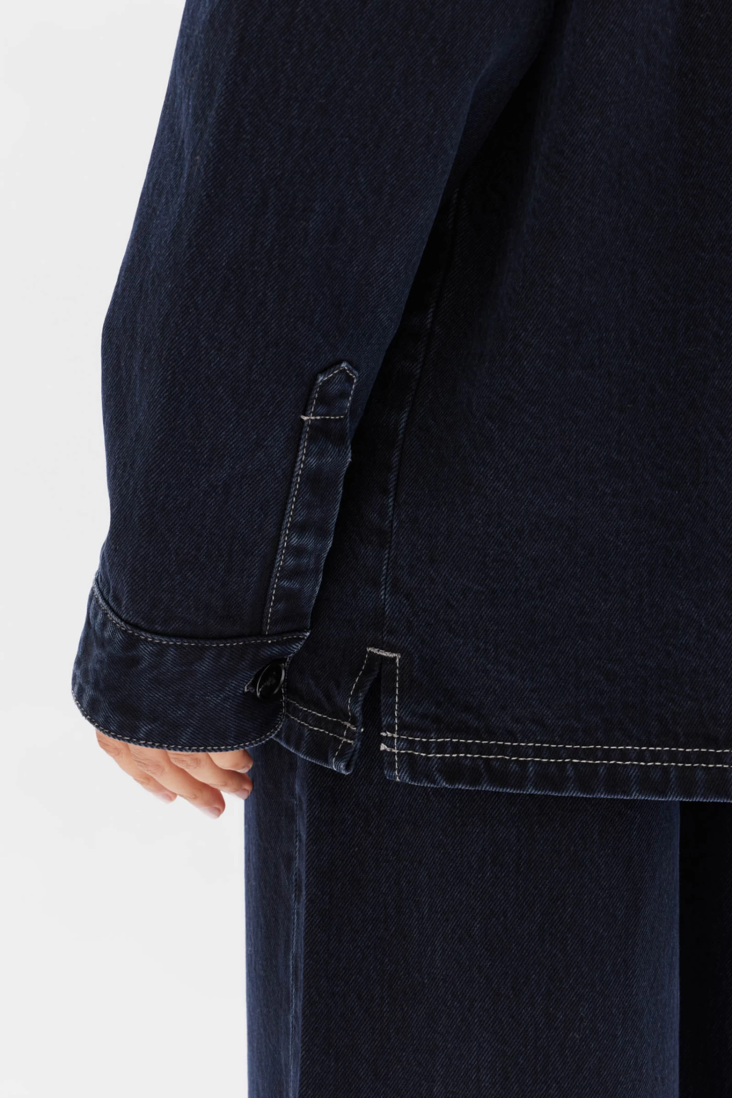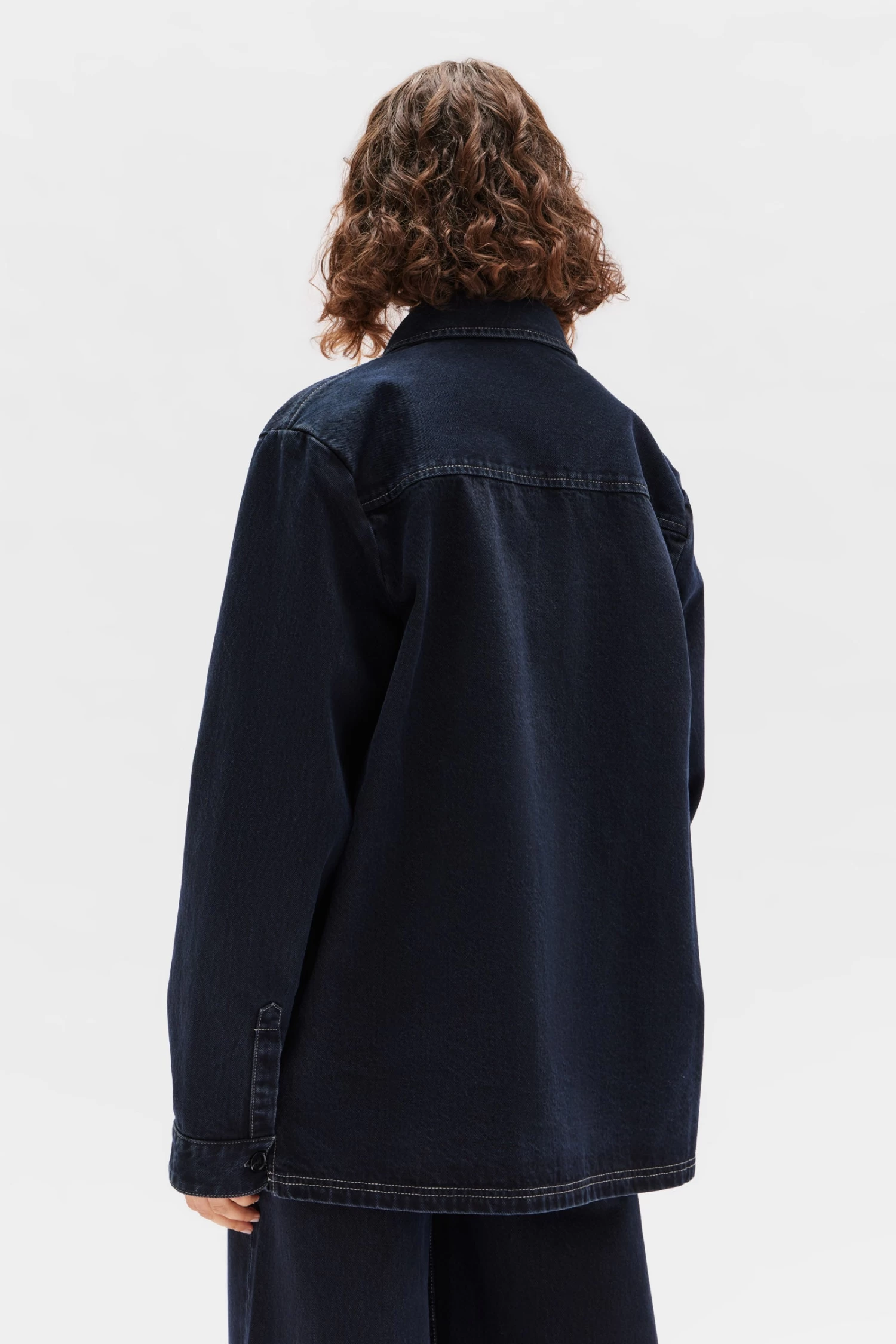 The Denim Overshirt is our updated take on a wardrobe classic. Cut from dark indigo wash denim with contrast ecru stitching, this button up overshirt can be styled and worn like a denim jacket. It features a collar, chest pocket, buttoned cuffs, subtle splits at the sides and an oversized fit that creates an off-duty feel.