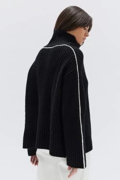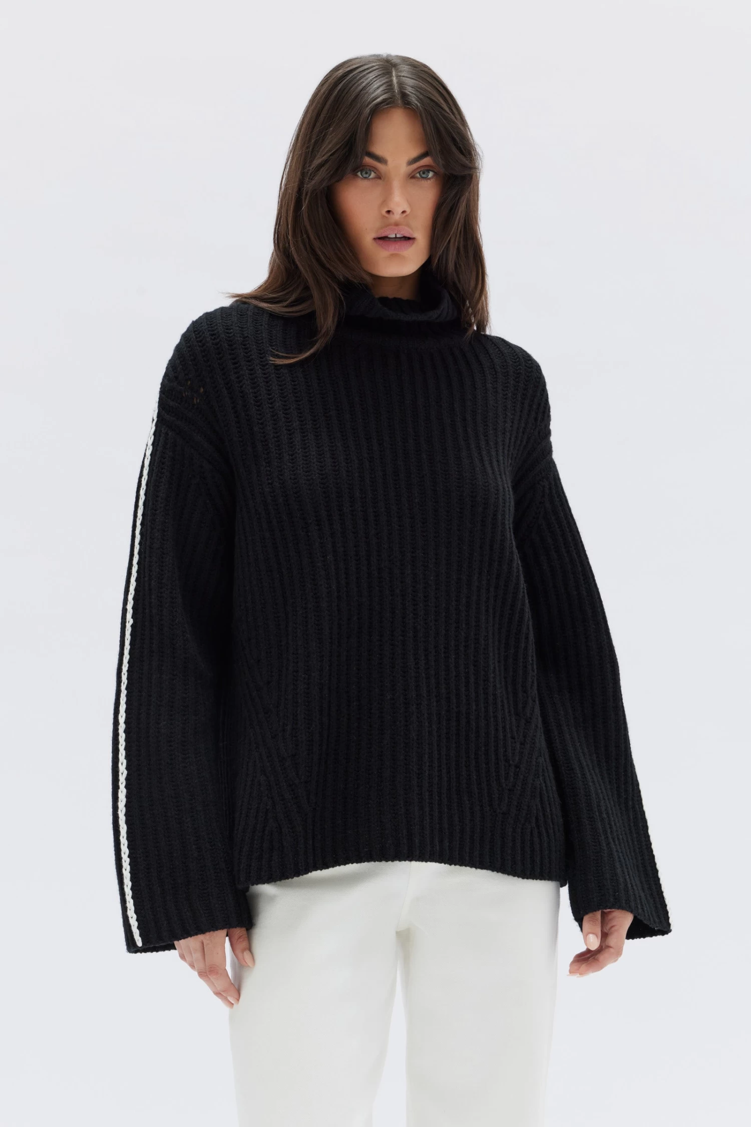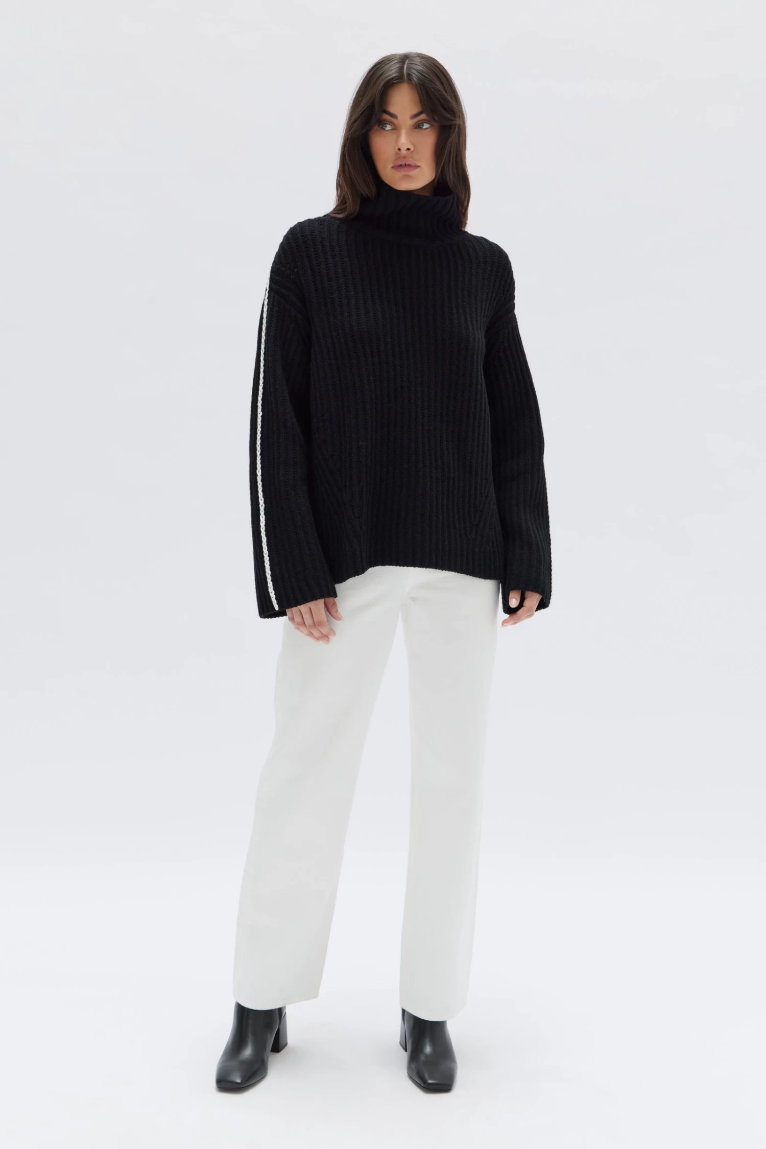 The Nari Knit is a classic knitwear style elevated with contrast white stitching. Crafted from 100% wool and designed for an oversized fit, this rollneck sweater features side splits and contrast detailing down the arms. The textural rib knit is chunky but not heavy, making this rollneck sweater perfect for layering.