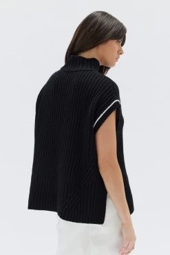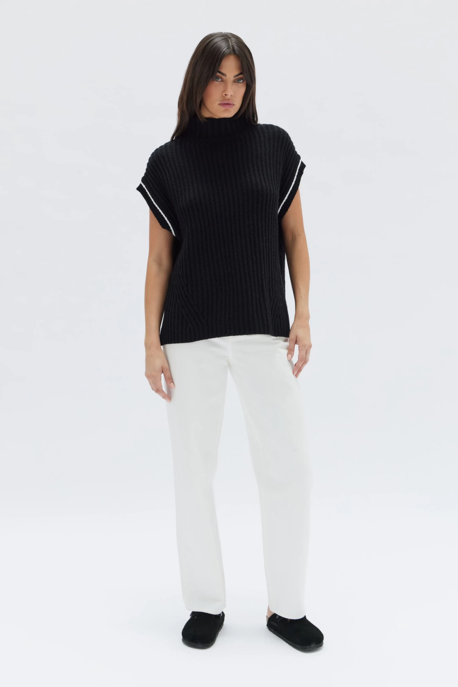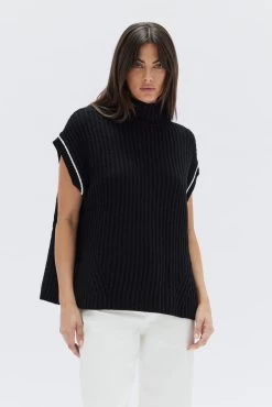 The Nari Vest is our modern take on a classic knitwear style. This 100% wool vest is detailed with contrast white stitching around the arms and is designed for an oversized, boxy fit with a mock neckline, side hem splits and a chunky ribbed knit texture. Style over long sleeve tees and shirts, or wear as a top.