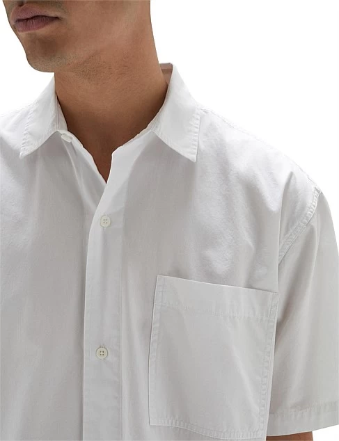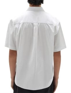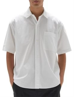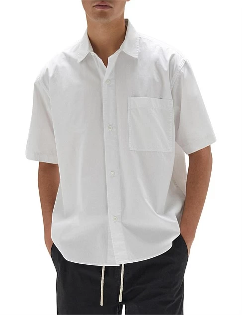 The Simon Poplin Short Sleeve Shirt is an everyday wardrobe essential. Crafted from mid-weight cotton poplin, this short sleeve collared shirt has a modern boxy fit and features a box pleat, tonal buttons and chest pocket. Wear it buttoned up, or leave it undone and layered over a cotton tee.