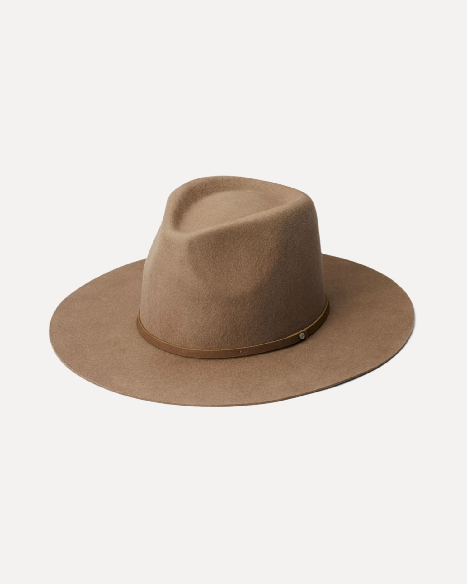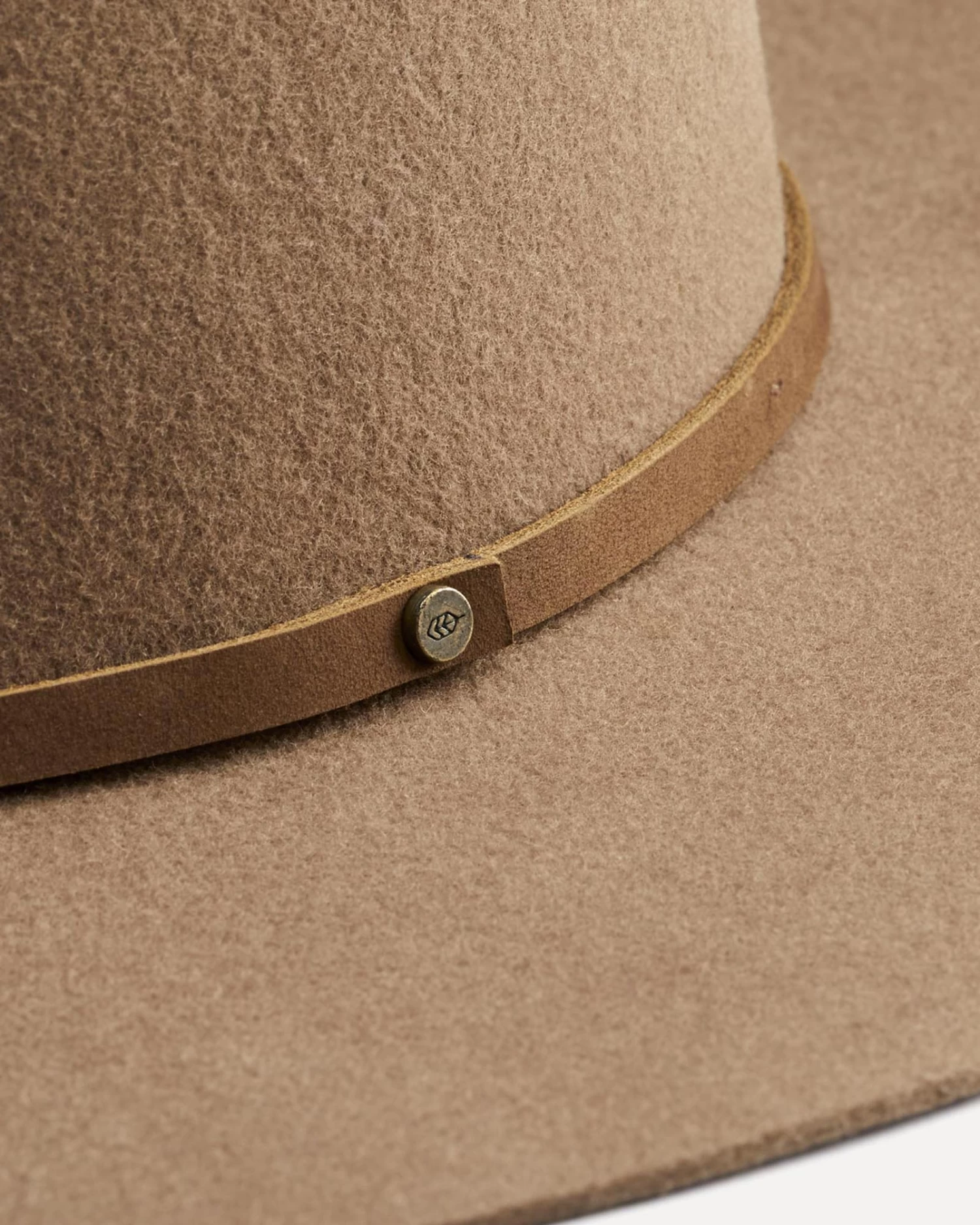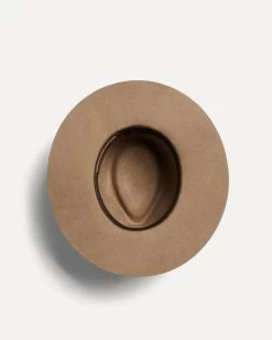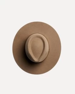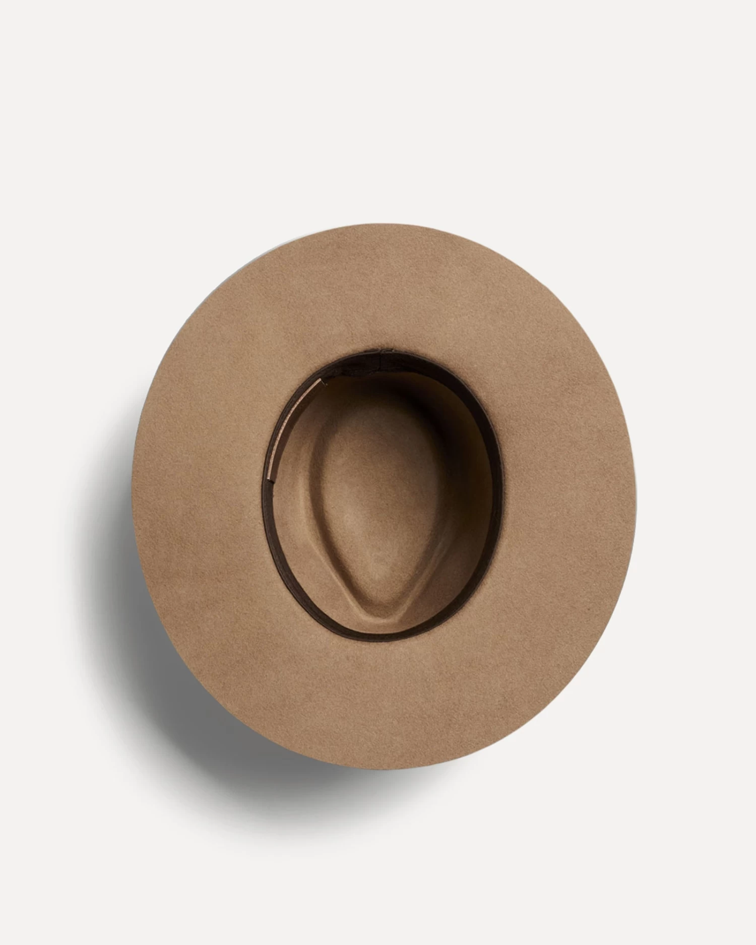is inspired by the classic outback fedora with a simpler aesthetic. Made from stiffened caramel brown Australian wool with a 9cm brim.
